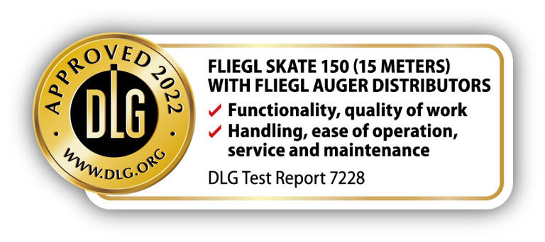 DLG APPROVED. The test serves to highlight special innovations and key criteria of the subject of the test. However, approved does not equal approved since there is a certain evaluation scope in which some products perform better, others not so well. The Fliegl SKATE 150 with its well-known Fliegl screw distributors is DLG APPROVED with excellent ratings in all test criteria.