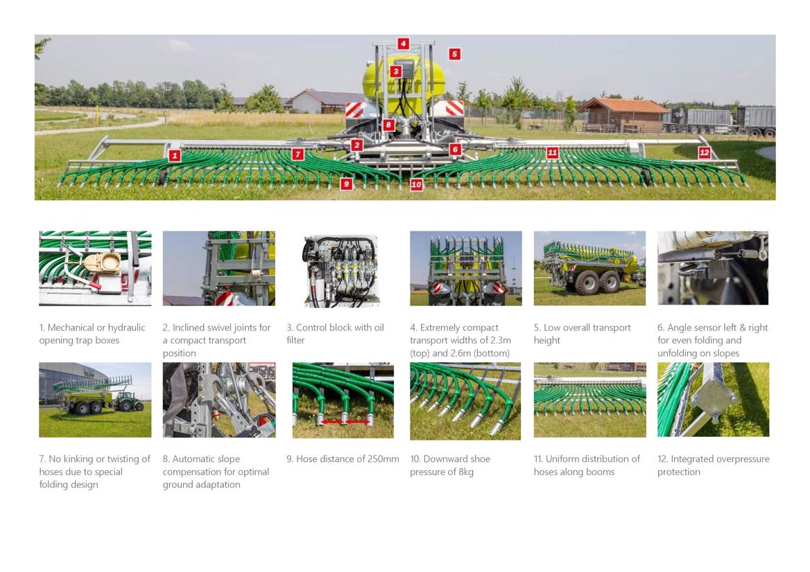 Coulter pressure of 8kg with hose spacing of 250mm Slope compensation of up to 7° for optimal ground compensation Integrated overload protection at boom ends Mechanically opening trap boxes A special folding mechanism and layout to enable short hose lengths, preventing kinks and reducing cracking + maintenance costs